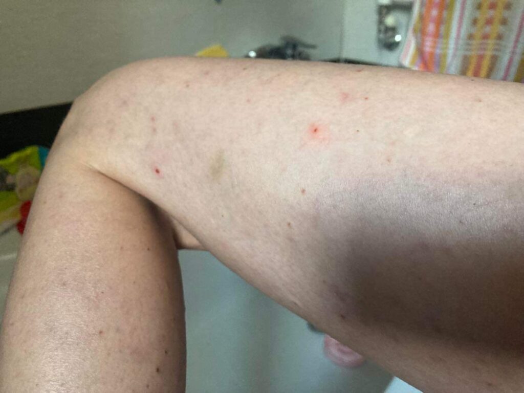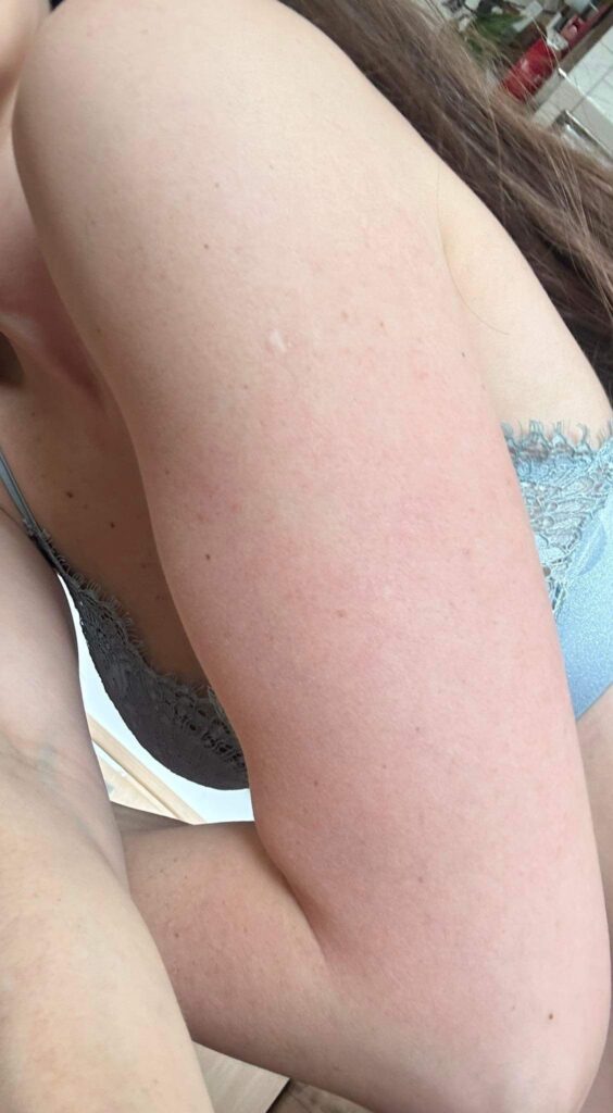 V té době jsem si všímala, že se mi nejprve na stehnech dělají zanícené pupínky, které se ozývaly svěděním. Někdy to byly zase bolavé velké červené boule občas 1-2 cm velké, takže nic hezkého. Bohužel se to rozšířilo všude možně po těle, na lýtka, paže, občas na dekolt, obličej, záda. Ty svědivé pupínky jsem si pravidelně rozškrábala, díky čemuž jsem měla neustále nějaké strupy a následně jizvy. Jeden známý mi v létě řekl, že vypadám, jakoby mě postřílel kulomet. To v hlavě 17 leté holky zůstane. Samozřejmě jsem se od té doby oblékala tak, abych nejlépe vše zakryla. Co se týče bazénů, saun, koupališť apod. To bylo pro mě dlouho tabu.