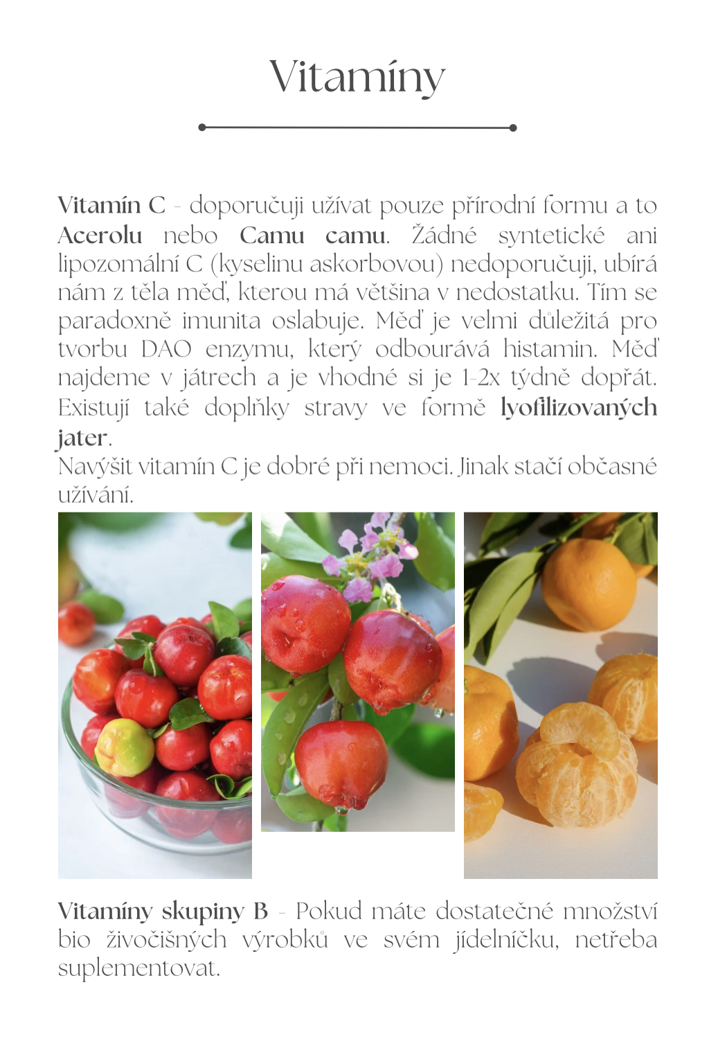- 5VITAMÍNYMyslím si, že pokud dopřáváte svému tělu kvalitní stravu především ze základních surovin, které podporují metabolismus člověka, není potřeba suplementovat žádné vitamíny. Ale pokud se vyskytne zdravotní problém, mohou být některé vitamíny, či doplňky stravy velmi vhodné.